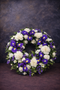 Această coroană funerară elegantă de 45 cm, realizată în nuanțe de alb și mov, transmite respect, compasiune și un ultim omagiu persoanei dragi.
